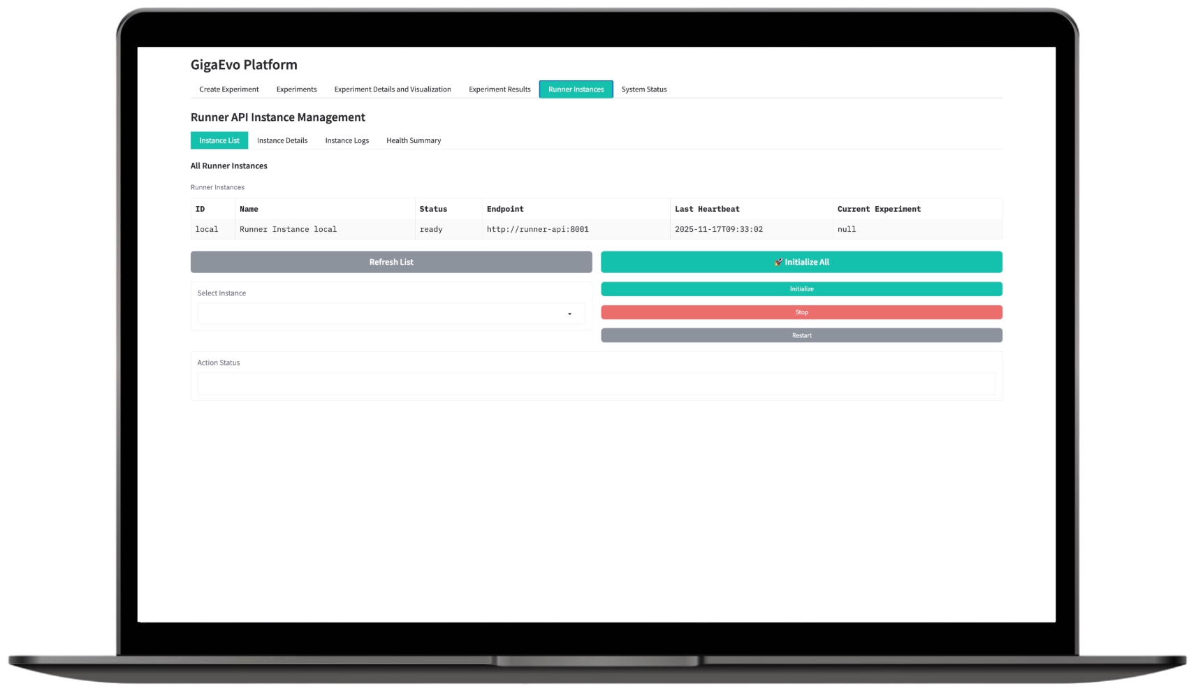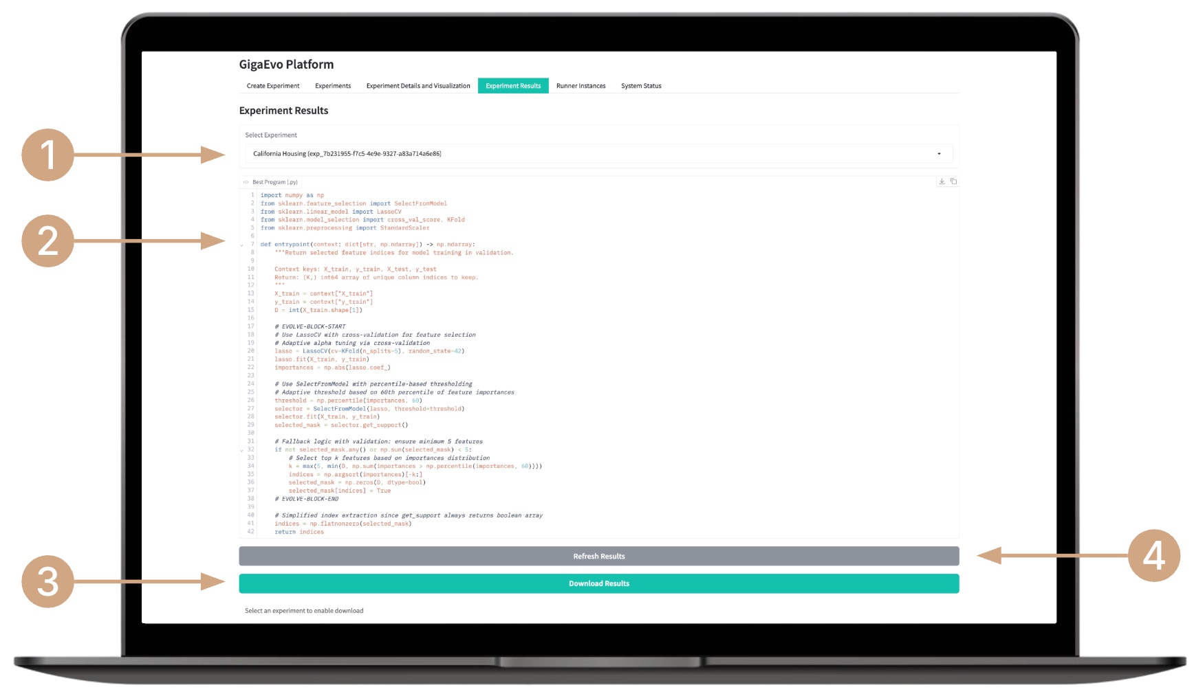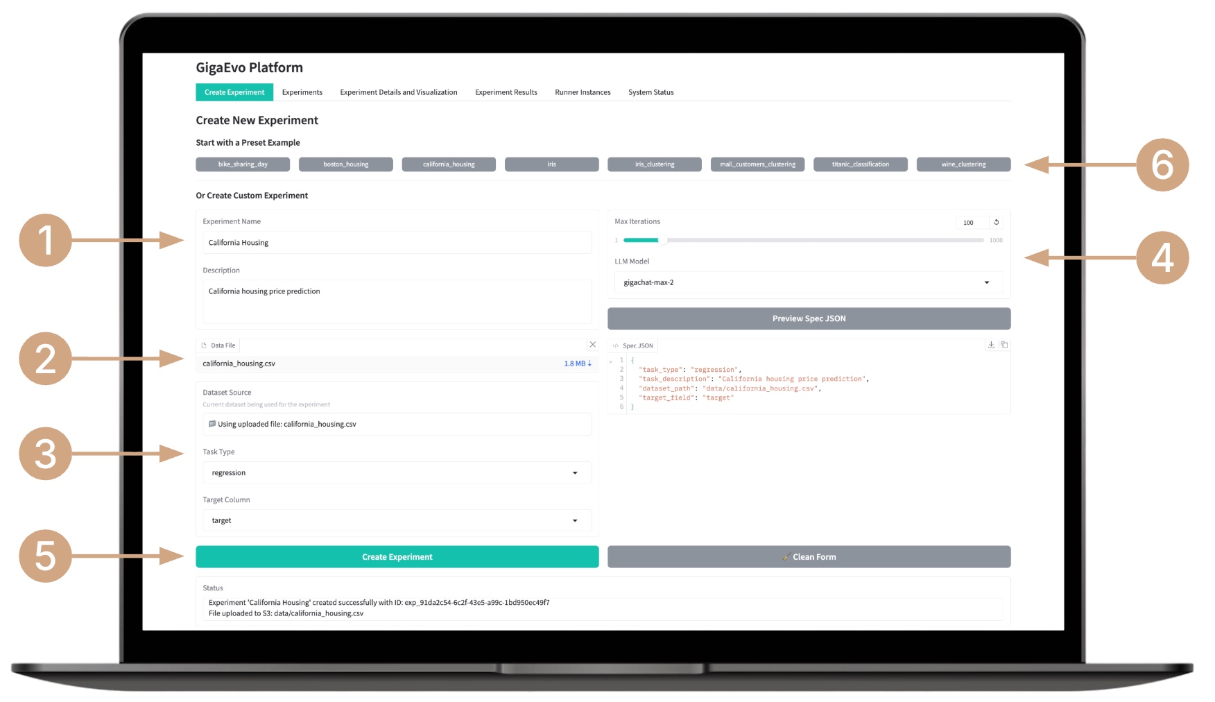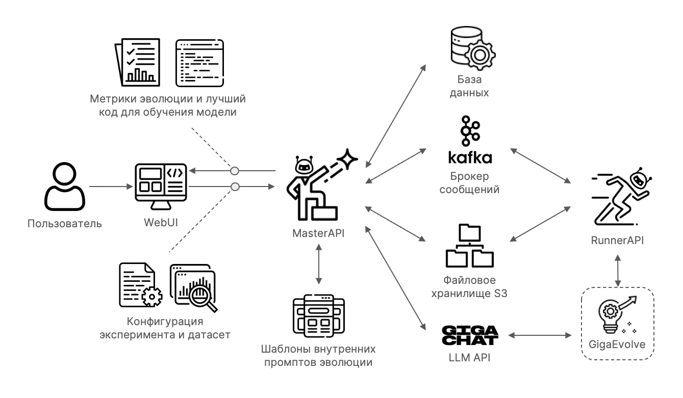 Фреймворк GigaEvo — обеспечивает полный автоматизированный цикл ML-экспериментирования — от загрузки данных до получения оптимального решения — используя эволюционный поиск стратегий обучения с LLM-мутациями и строгой валидацией. Платформа предлагает удобную визуализацию прогресса в реальном времени, значительно сокращает ручные трудозатраты: пользователь формулирует цель и предоставляет данные, а система выполняет все этапы автоматически. GigaEvo легко интегрируется с корпоративной инфраструктурой через Master API и S3/MinIO, масштабируется за счёт распределённых Runner-инстансов, очередей задач и изолированных рабочих пространств, а также поддерживает экспорт результатов в JSON, предоставляет оптимальную программу с метаданными и сохраняет артефакты в S3.