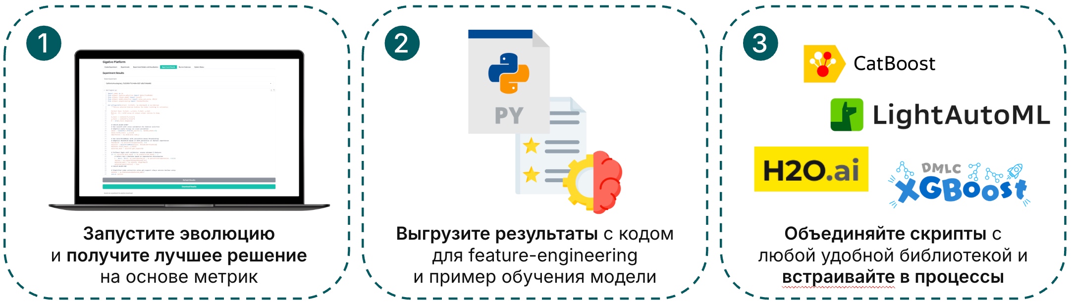• Автоматизация полного цикла: GigaEvo обеспечивает автоматизацию полного цикла ML-экспериментов — от загрузки данных до получения оптимального решения, включая автоматическую эволюцию стратегий обучения, при которой система самостоятельно находит и улучшает наиболее результативные подходы.